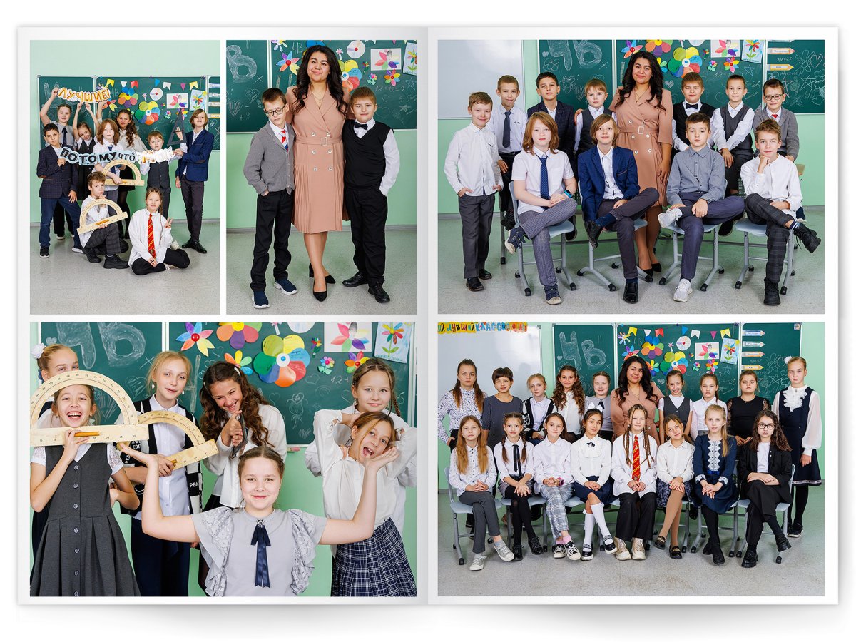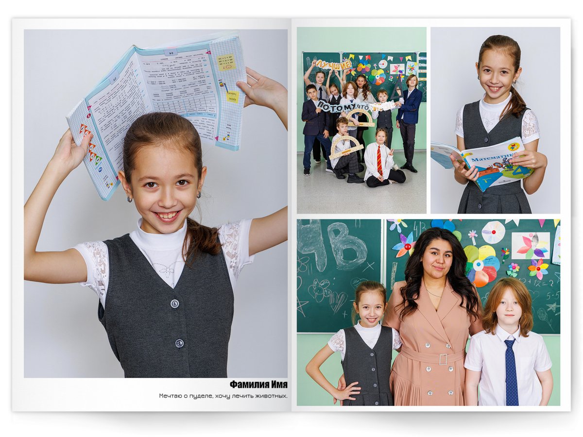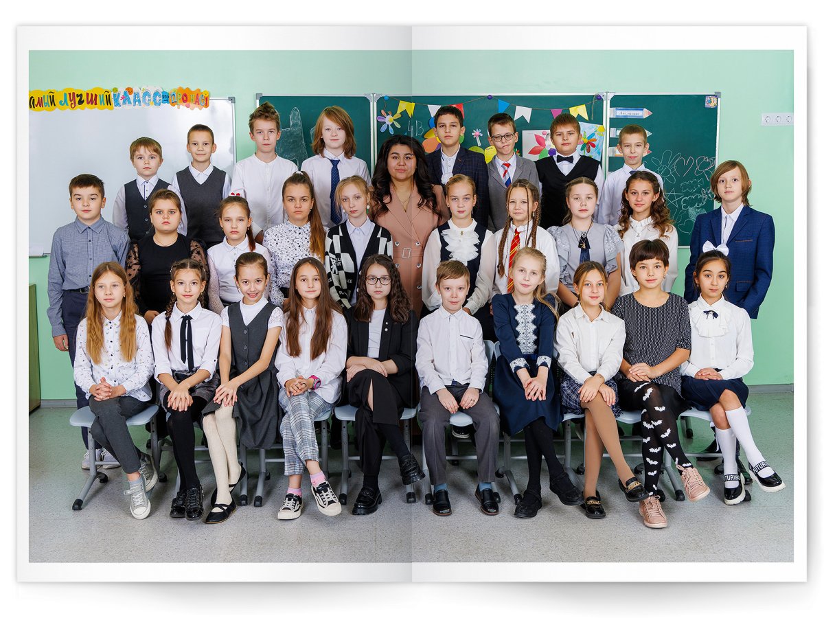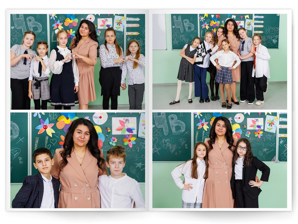 • Можно добавить общее фото всего класса на второй разворот +350 ₽ (будет альбом на 2 разворота)