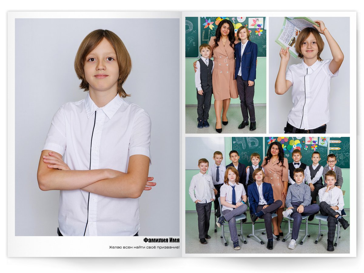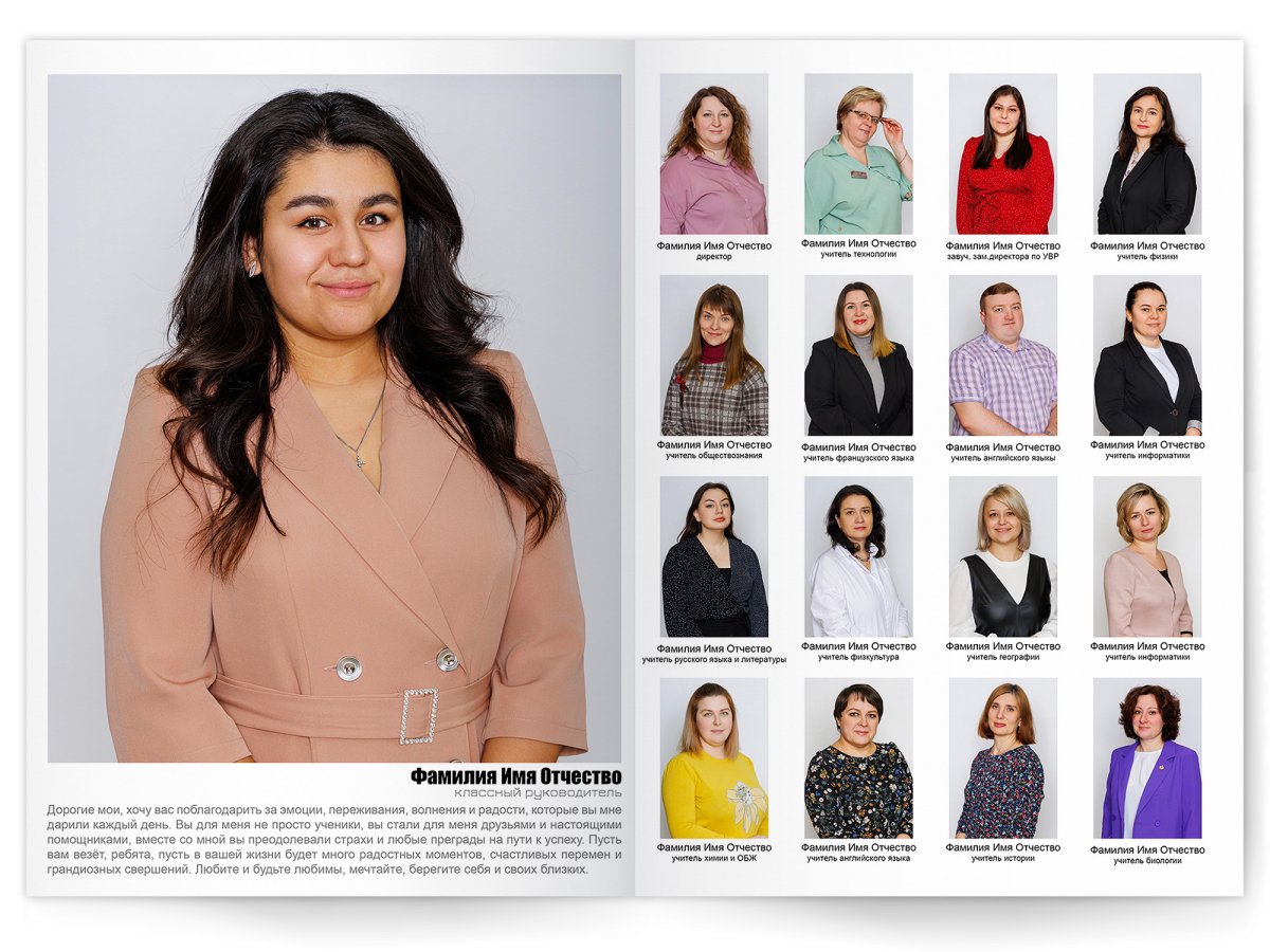 • Портреты всех одноклассников и классного руководителя на развороте или второй портрет на всю страницу слева, справа портреты всех одноклассников и классного руководителя