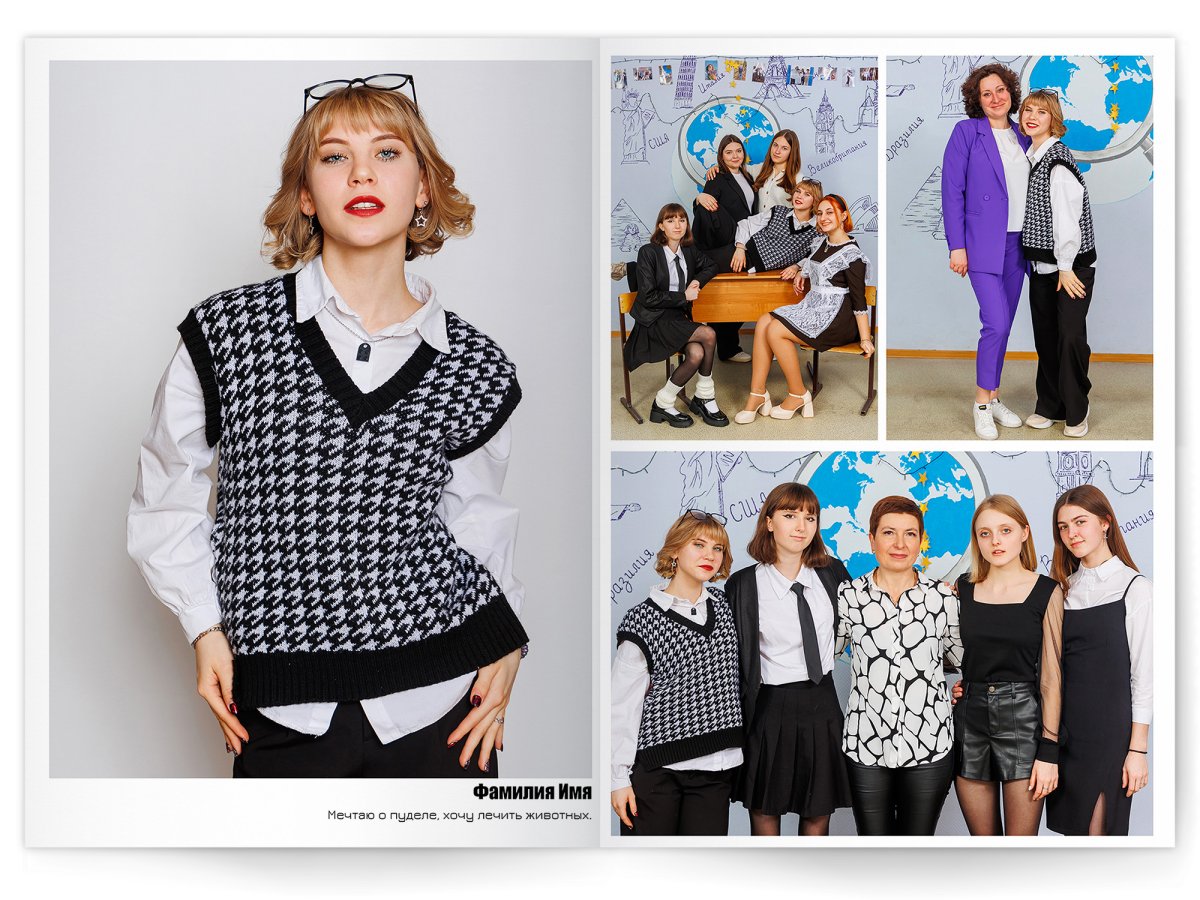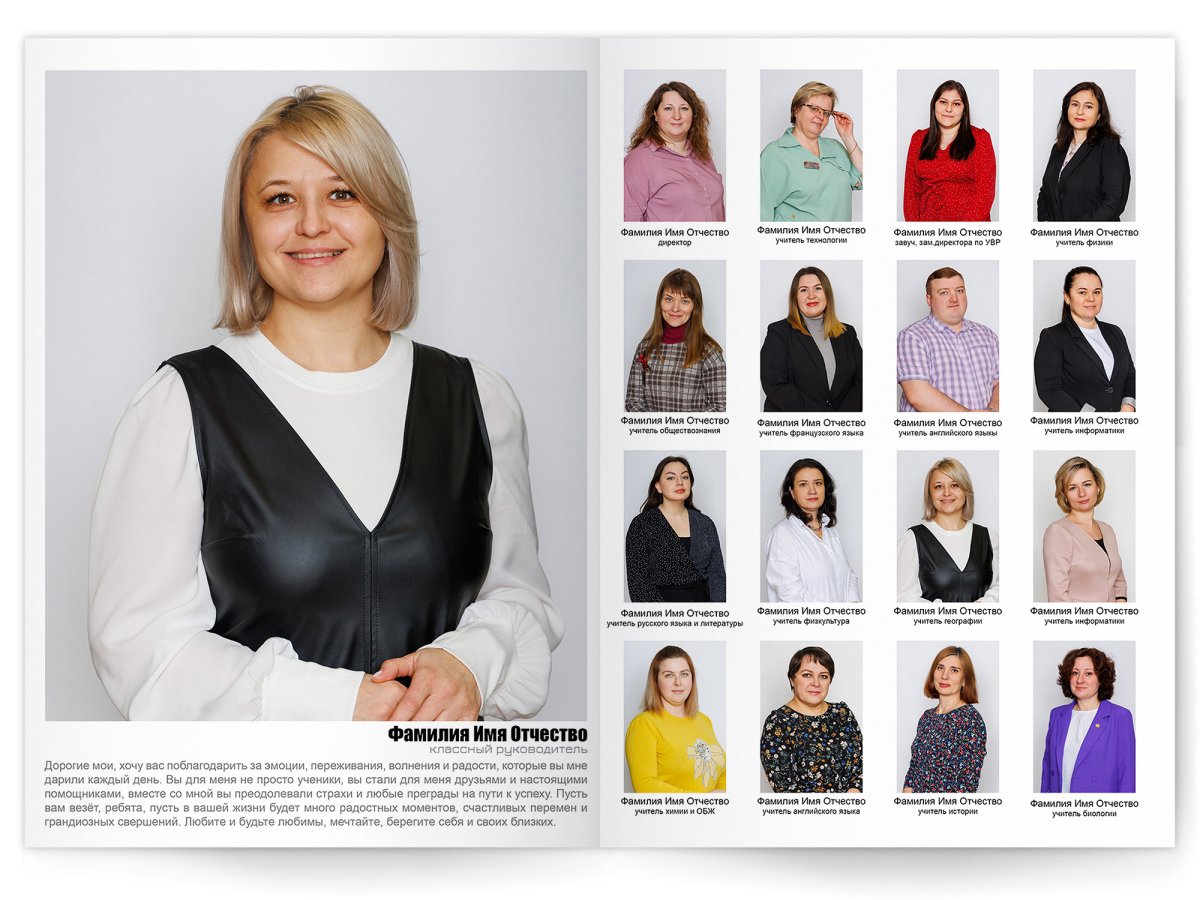 Портреты всех одноклассников и классного руководителя на развороте или второй портрет на всю страницу слева, справа портреты всех одноклассников и классного руководителя