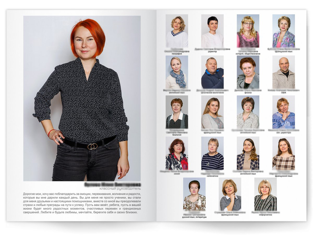 • Портреты всех одноклассников и классного руководителя на развороте или второй портрет на всю страницу слева, справа портреты всех одноклассников и классного руководителя