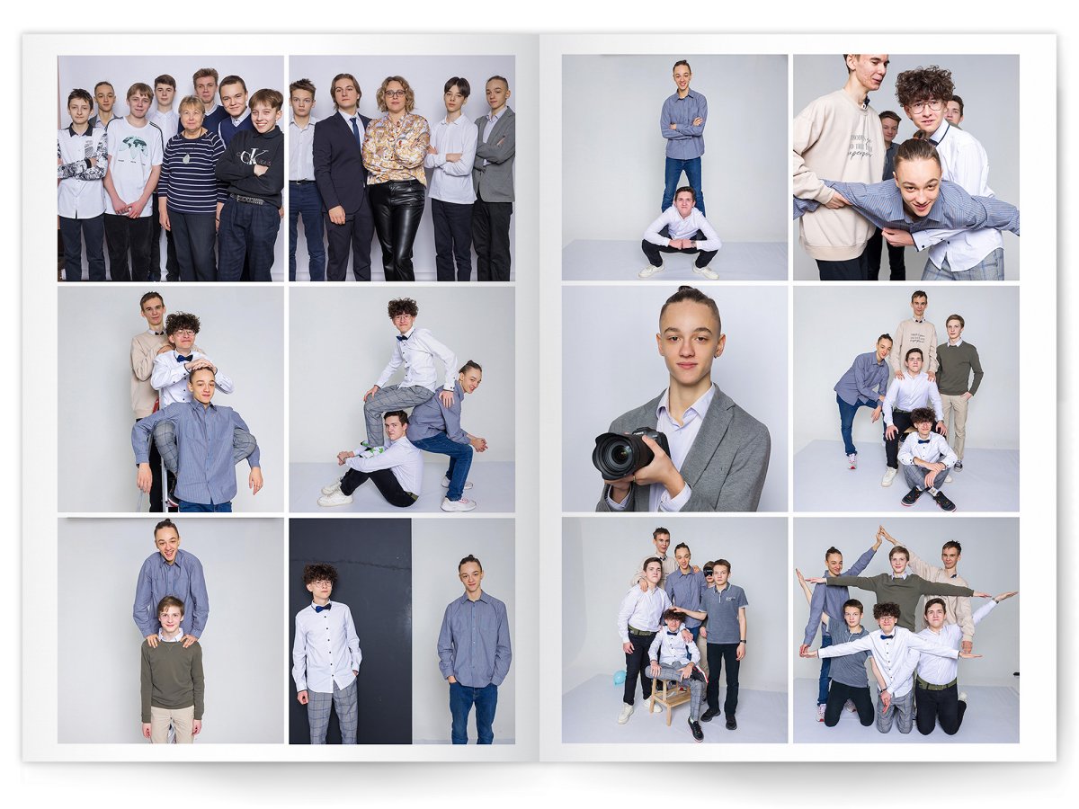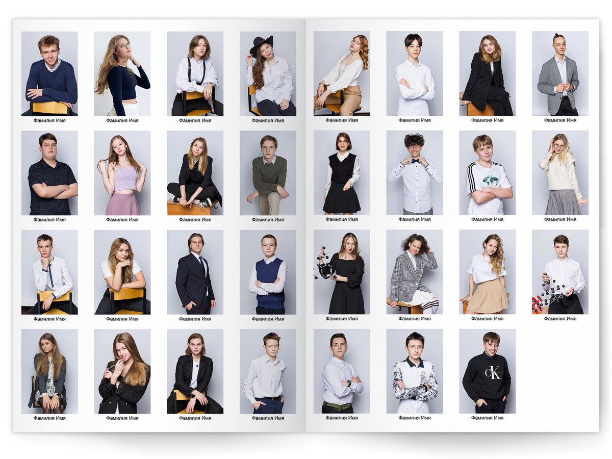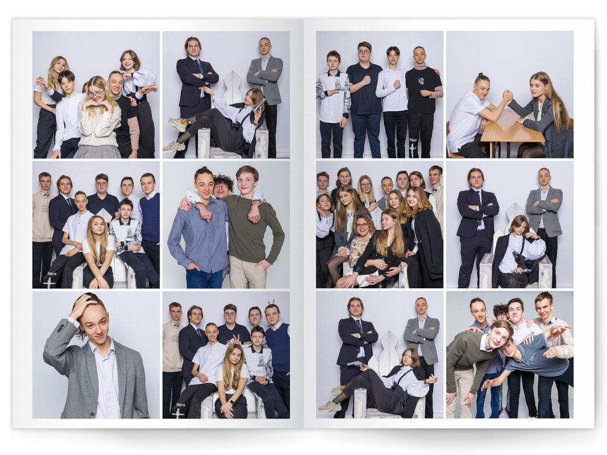 • Можно добавить общее фото всего класса на второй разворот +350 ₽ (будет альбом на 2 разворота)