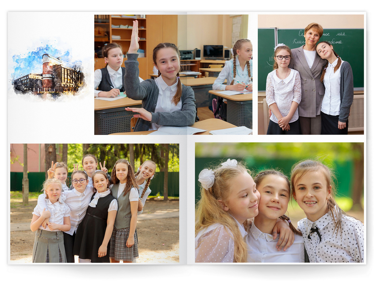 Можно добавить общее фото всего класса на второй разворот +350 ₽ (будет альбом на 2 разворота)