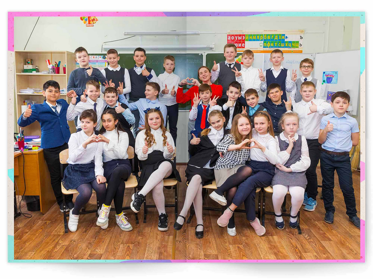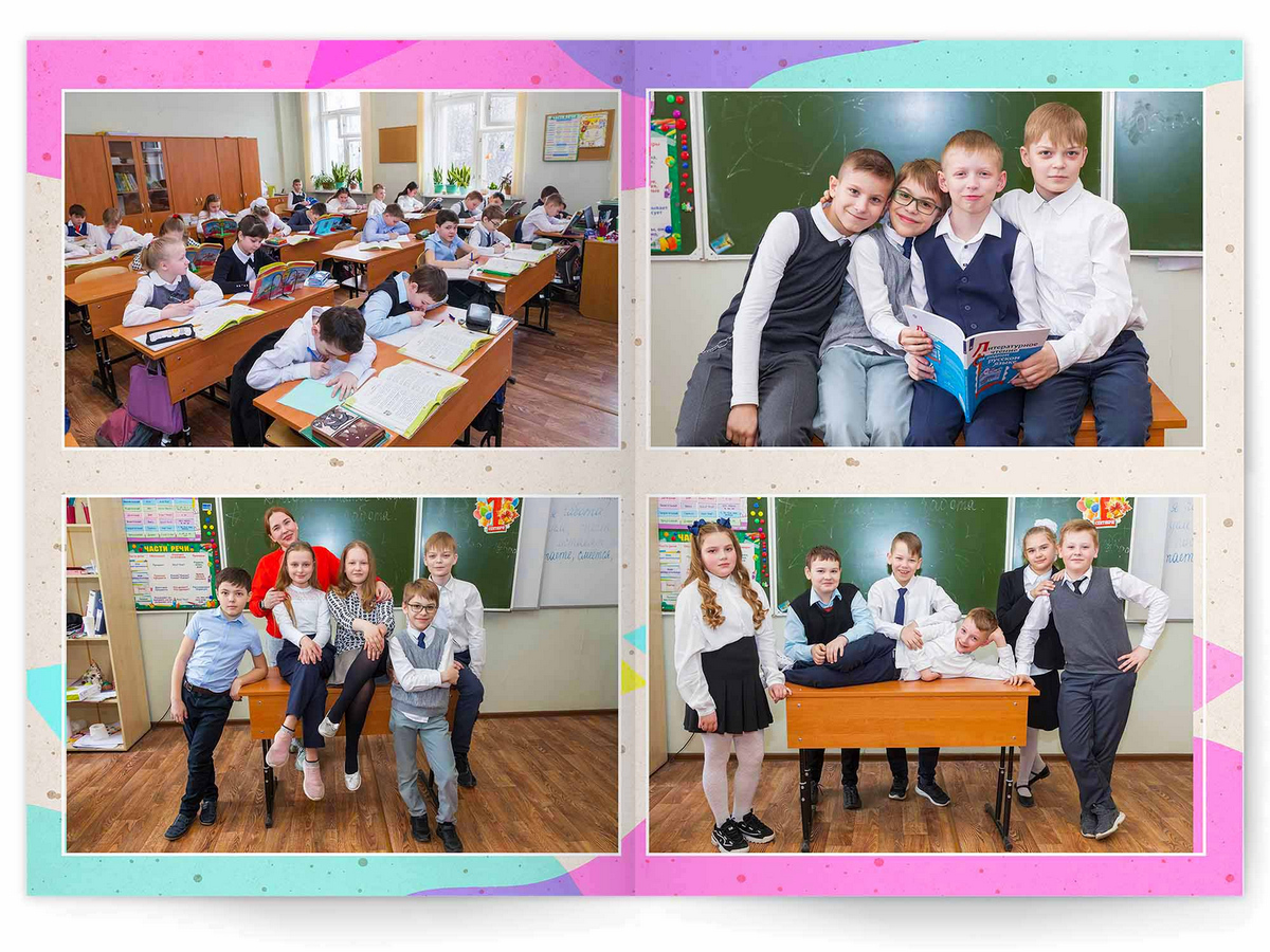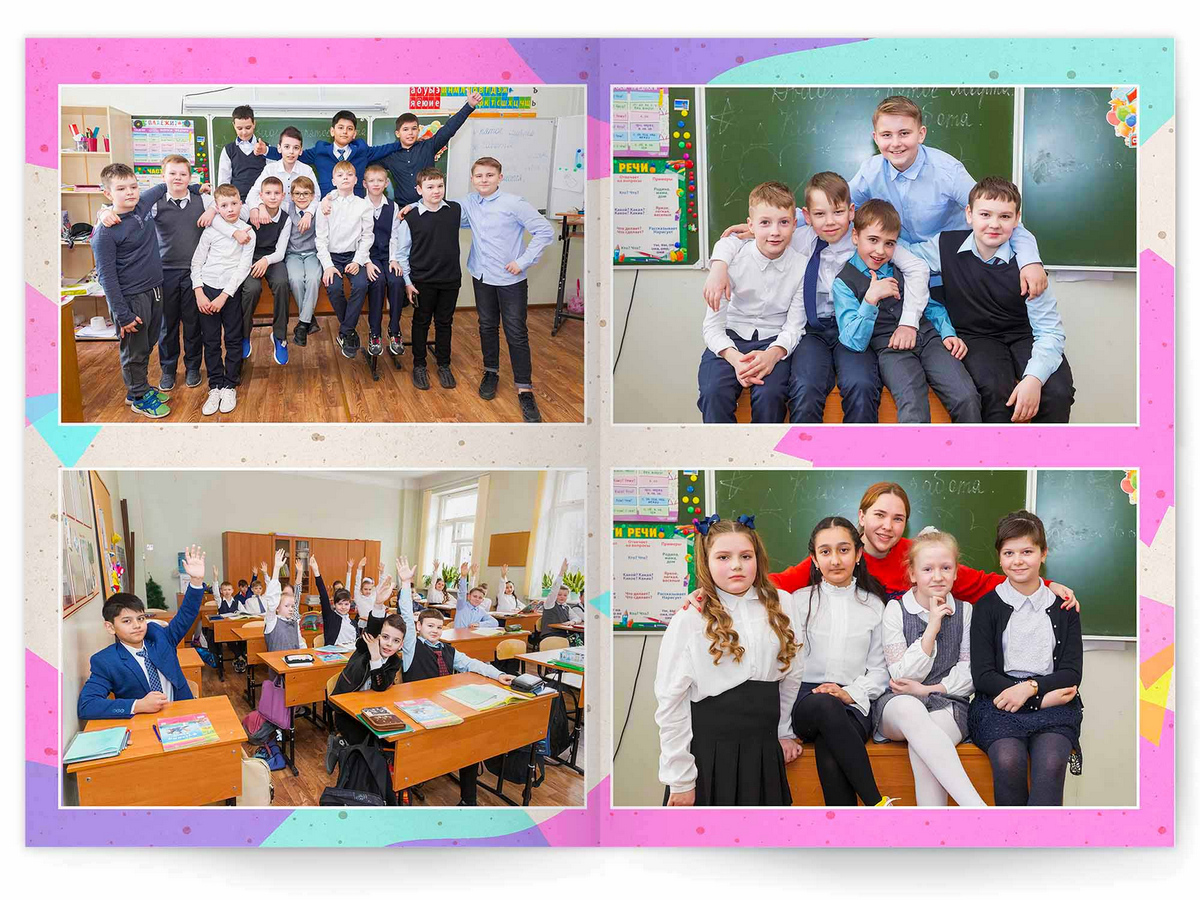• Можно добавить общее фото всего класса на второй разворот +350 ₽ (будет альбом на 2 разворота)