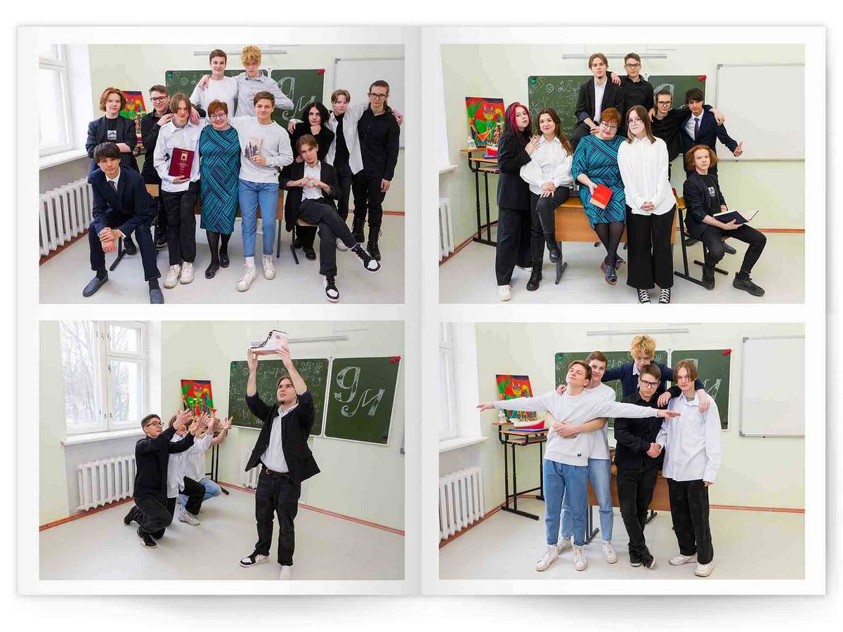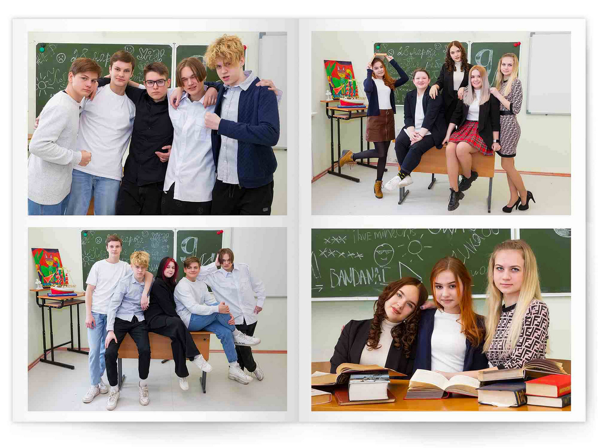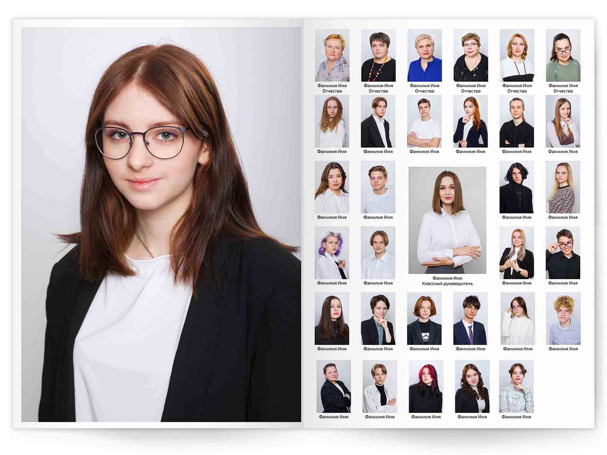 • Можно добавить общее фото всего класса на второй разворот +350 ₽ (будет альбом на 2 разворота)