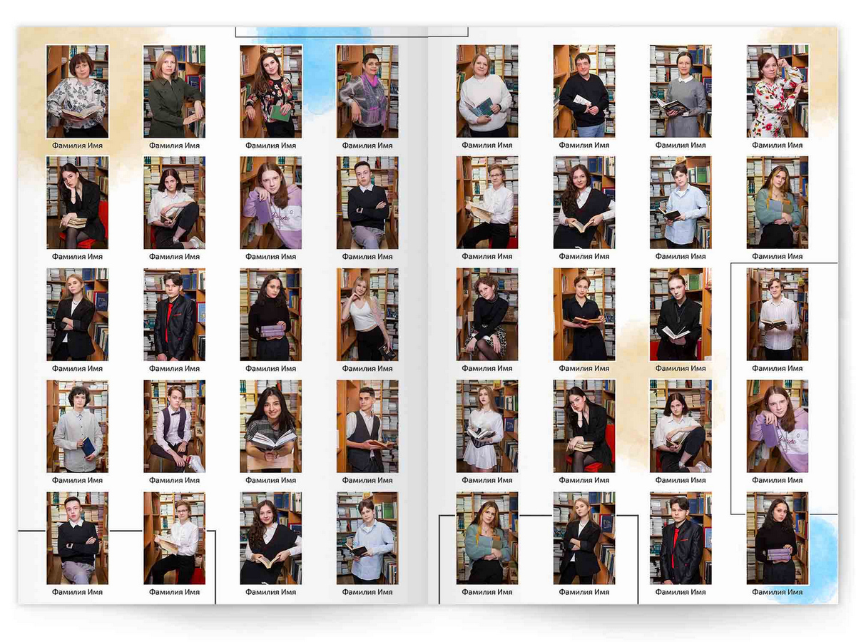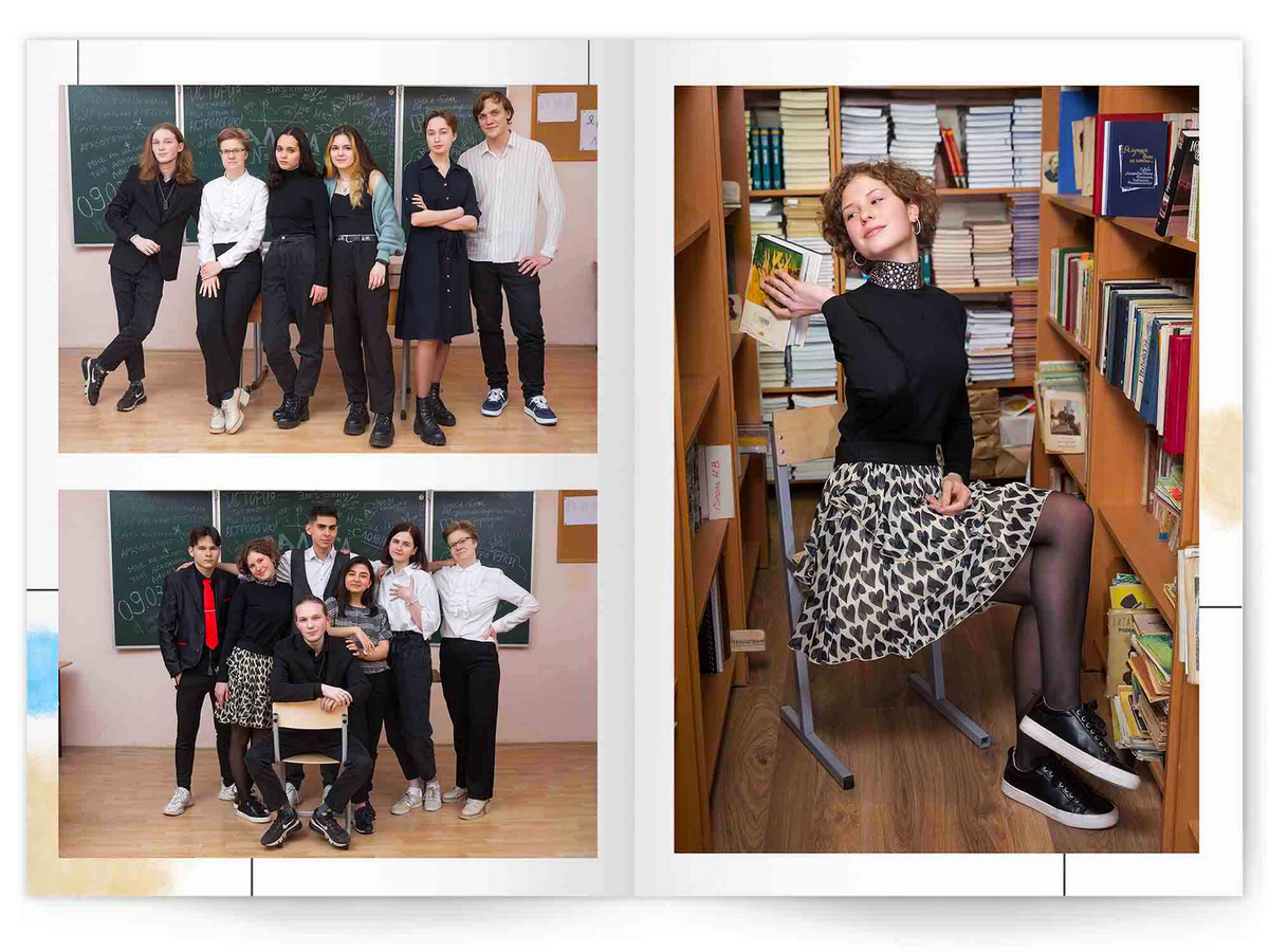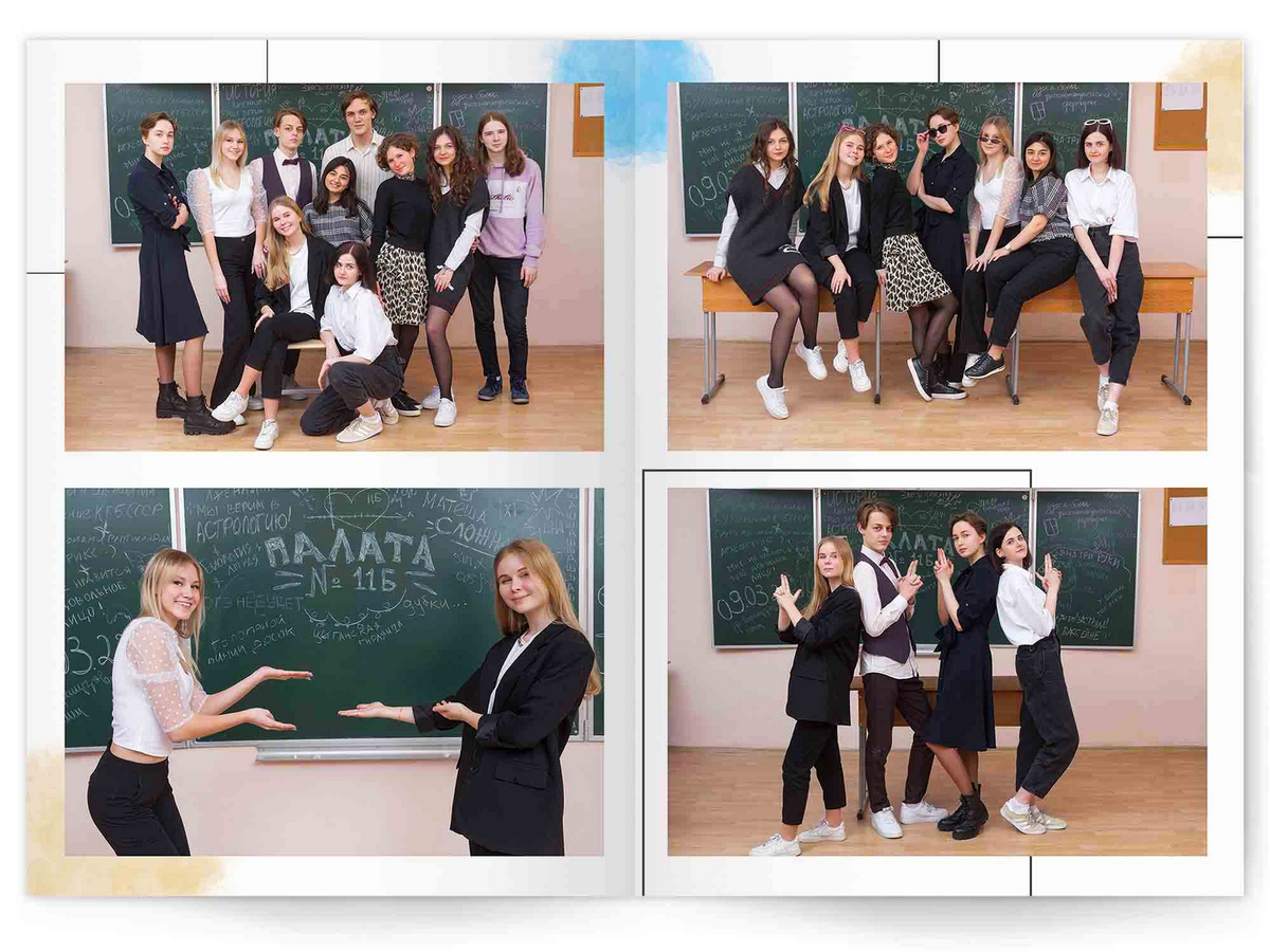 Портреты всех одноклассников и классного руководителя на развороте или второй портрет на всю страницу слева, справа портреты всех одноклассников и классного руководителя