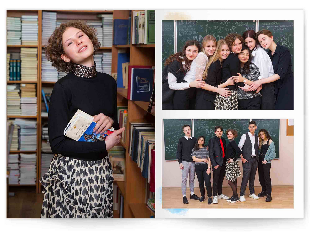 Можно добавить общее фото всего класса на второй разворот +350 ₽ (будет альбом на 2 разворота)