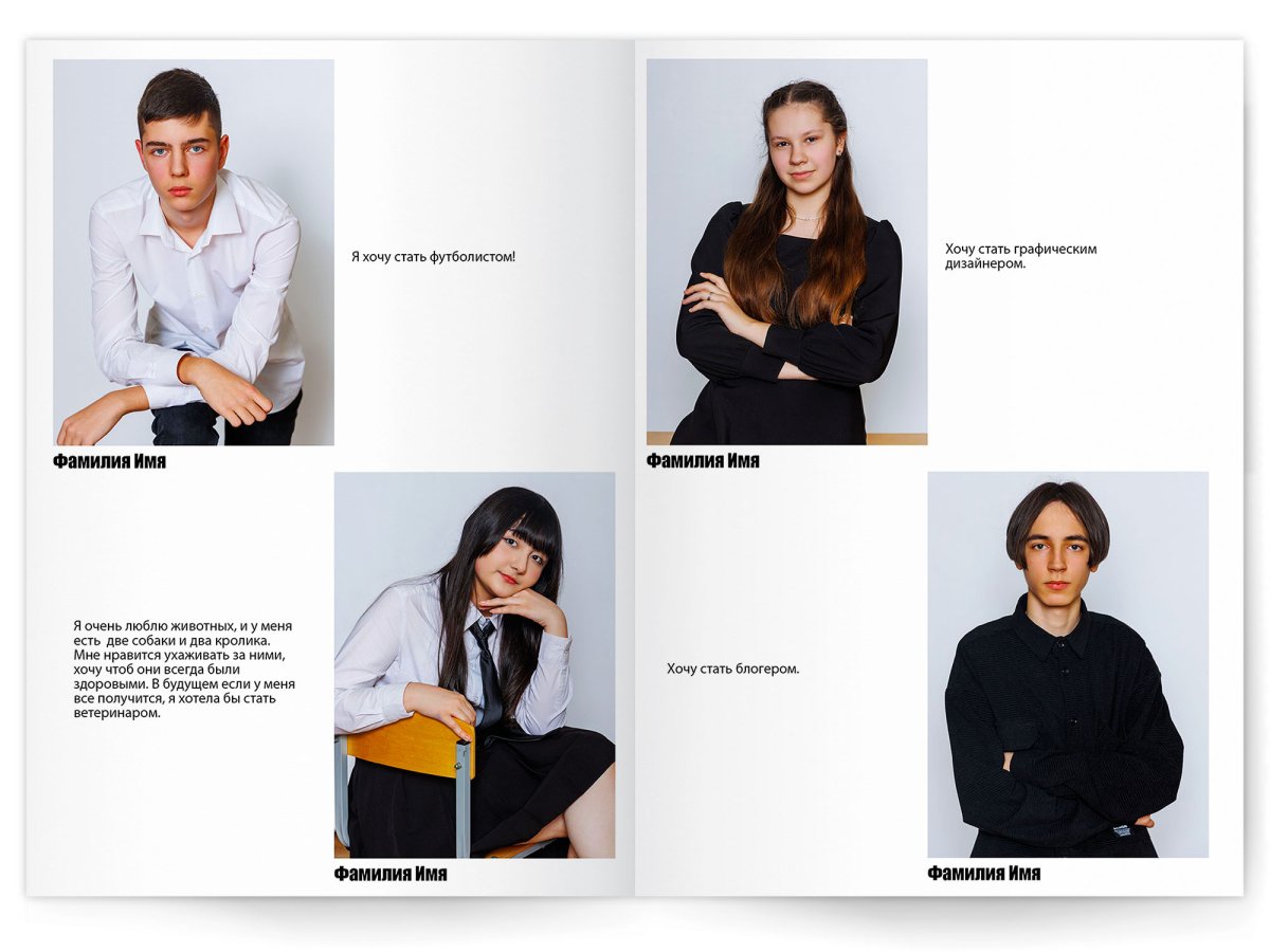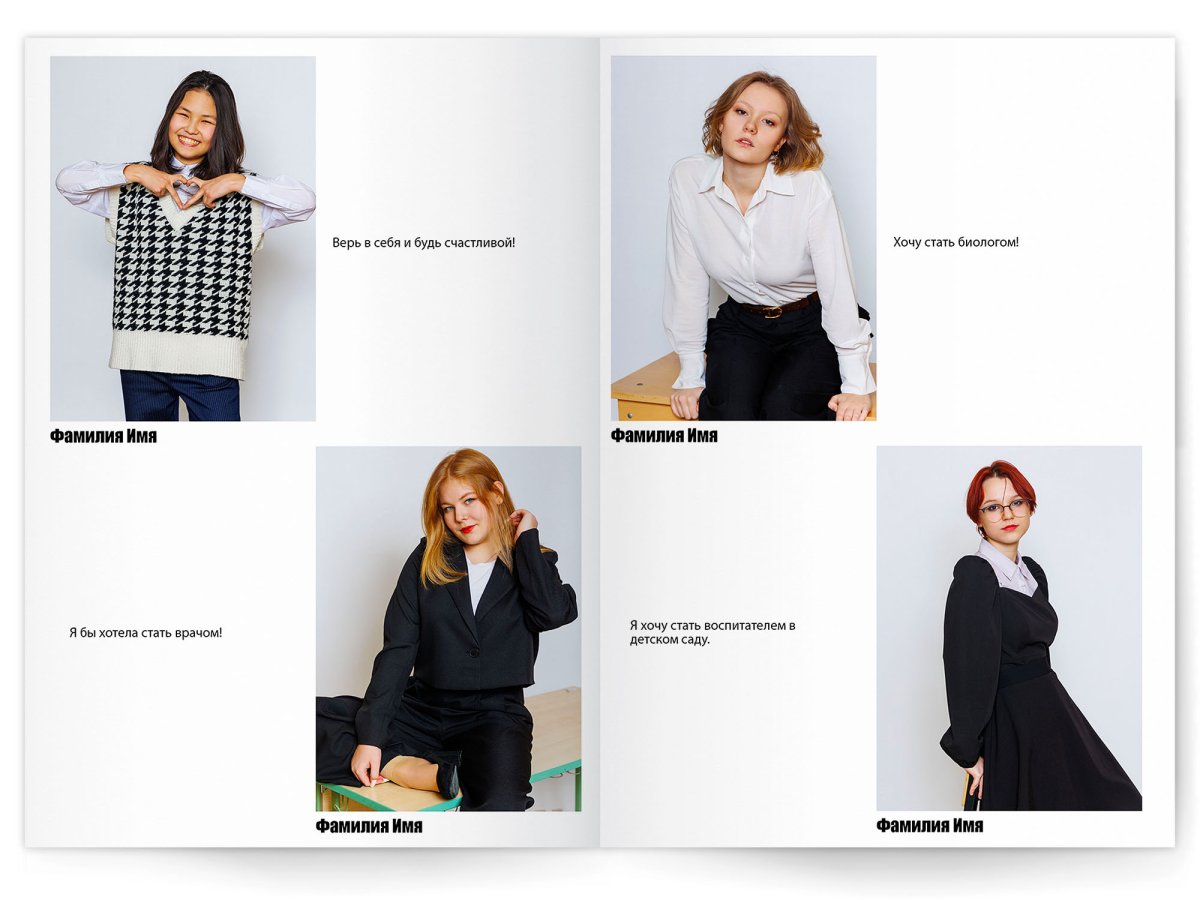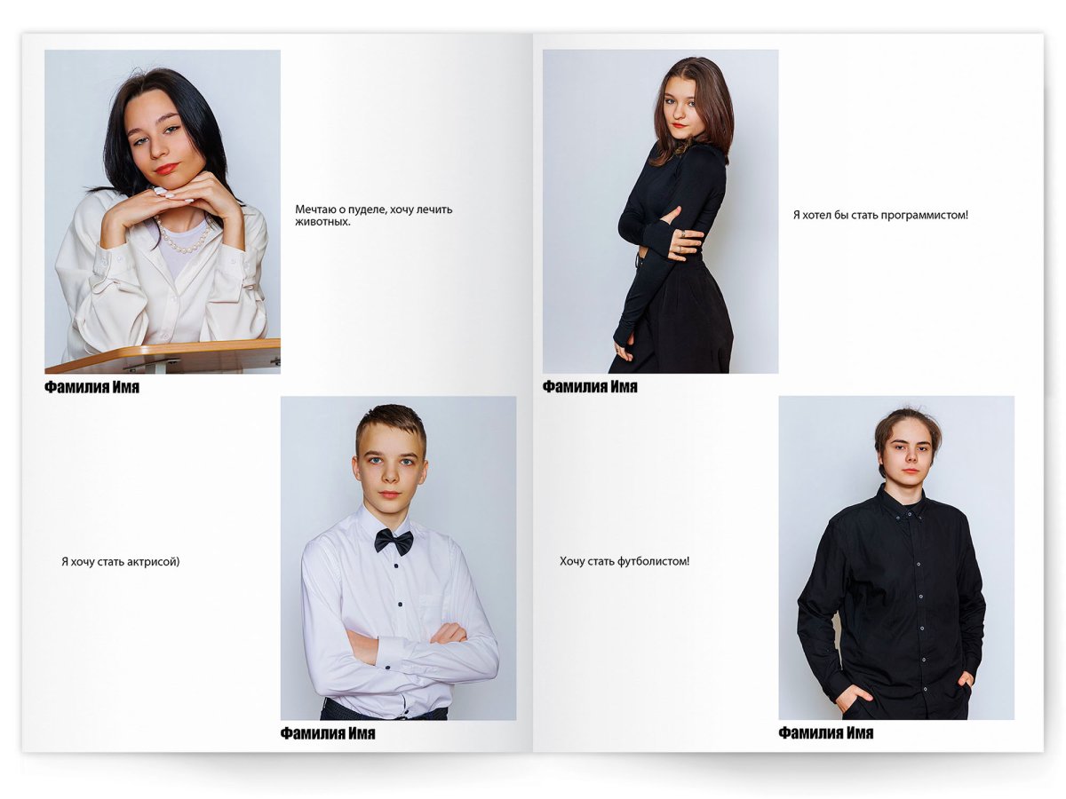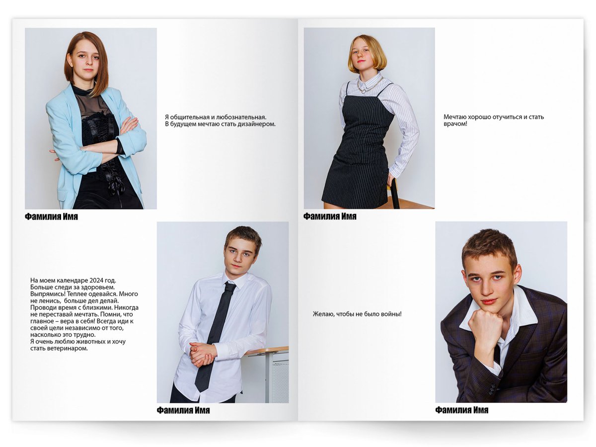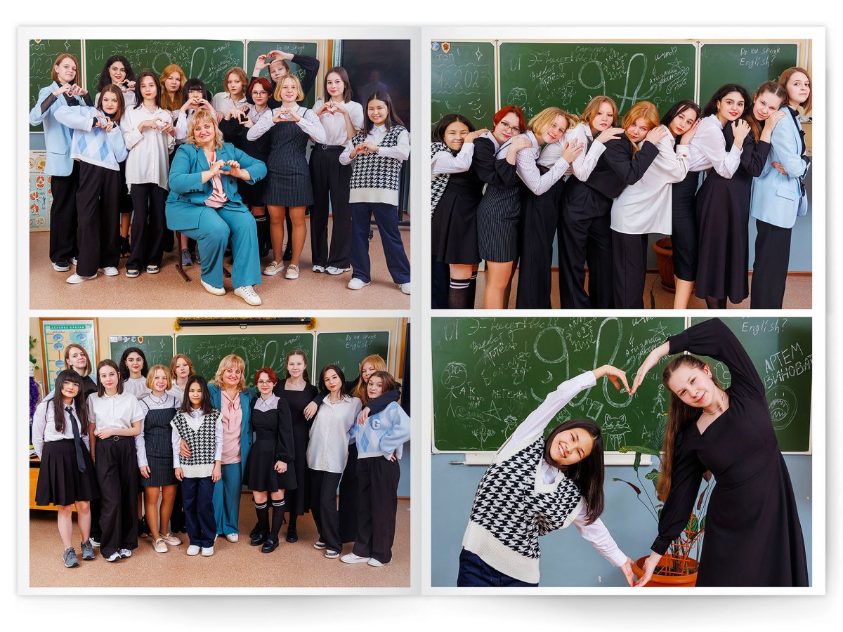 • Можно добавить общее фото всего класса на второй разворот +350 ₽ (будет альбом на 2 разворота)