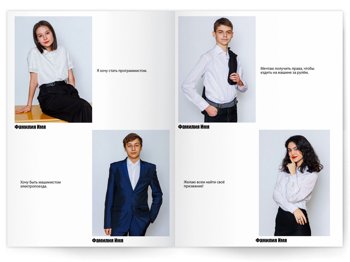 • Портреты всех одноклассников и классного руководителя на развороте или второй портрет на всю страницу слева, справа портреты всех одноклассников и классного руководителя