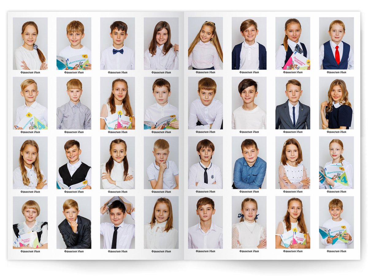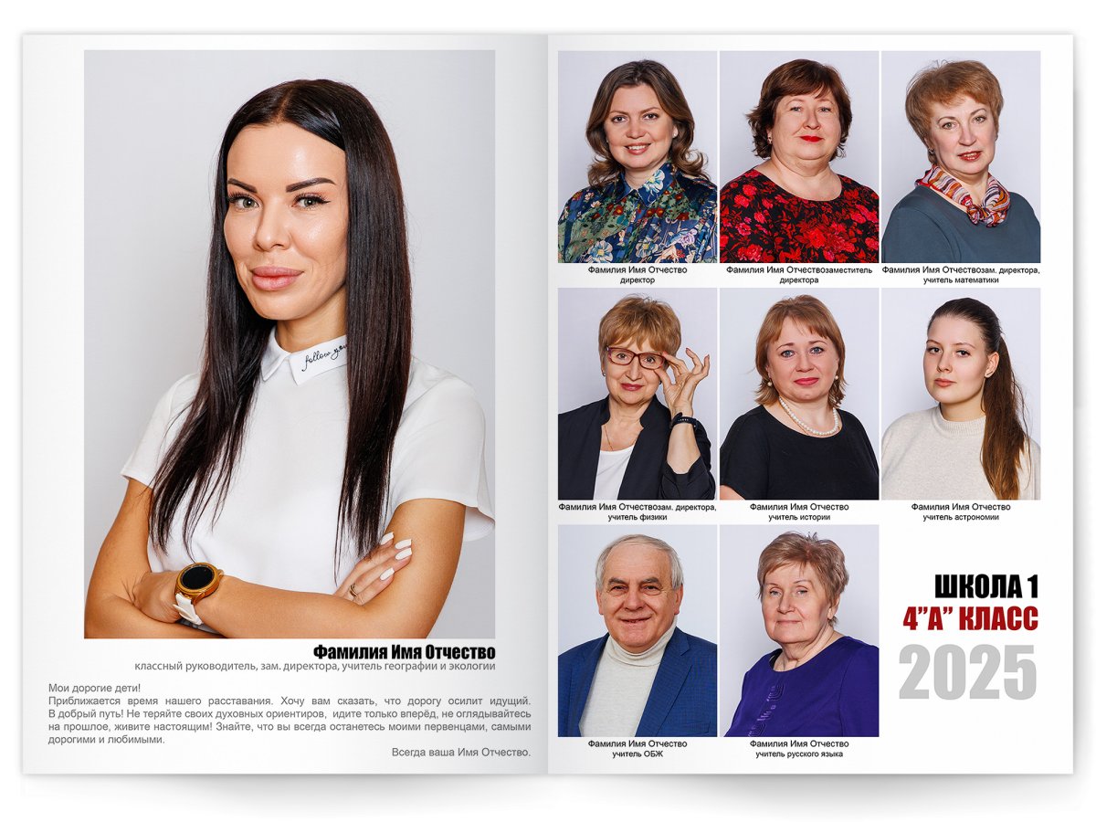 • Портреты всех одноклассников и классного руководителя на развороте или второй портрет на всю страницу слева, справа портреты всех одноклассников и классного руководителя