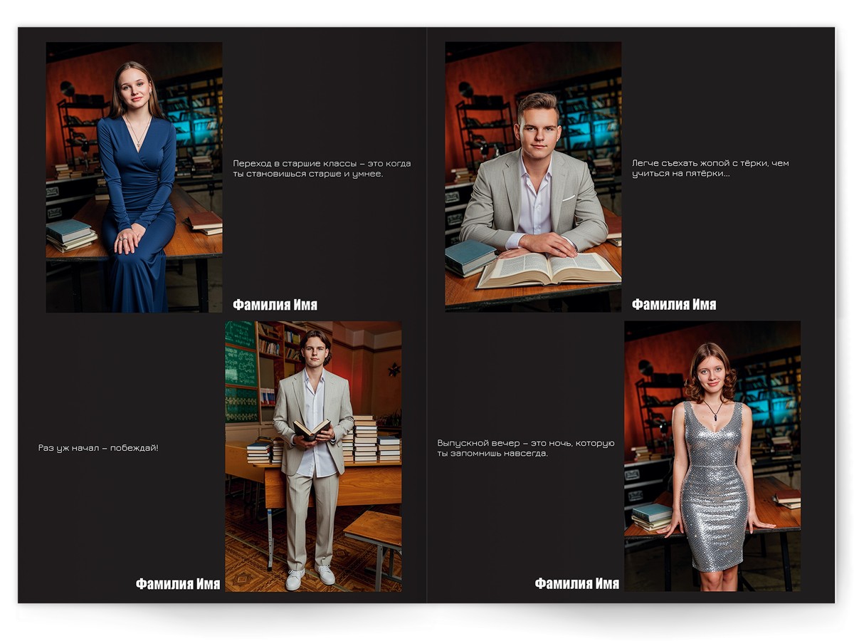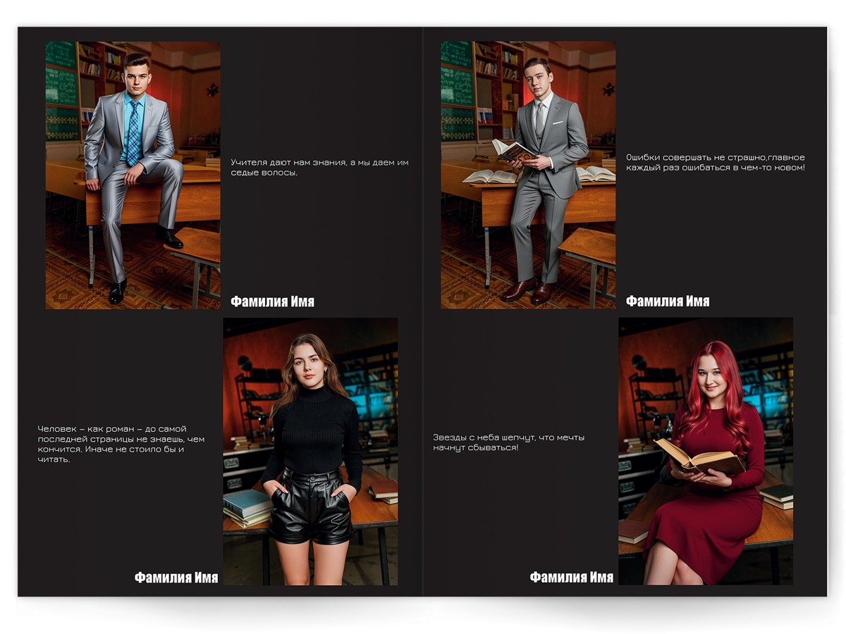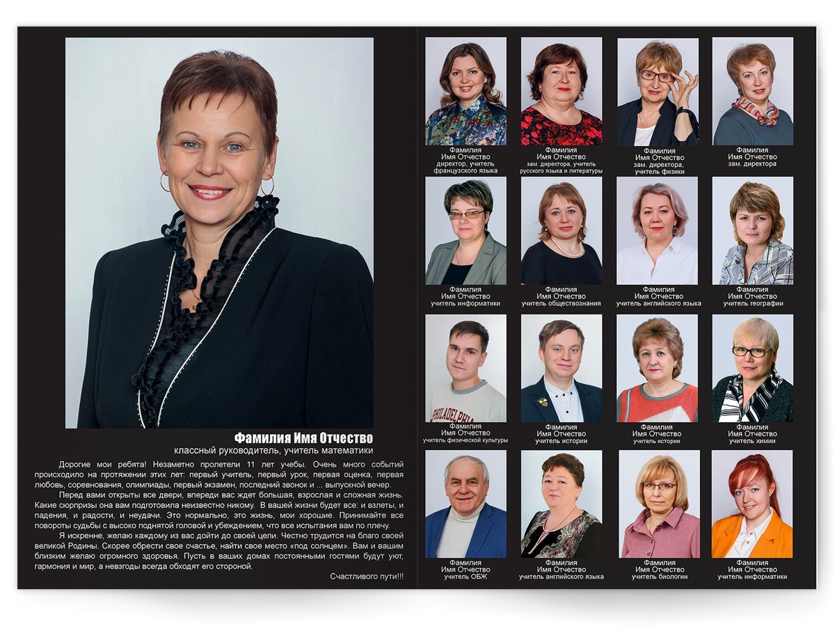 Портреты всех одноклассников и классного руководителя на развороте или второй портрет на всю страницу слева, справа портреты всех одноклассников и классного руководителя