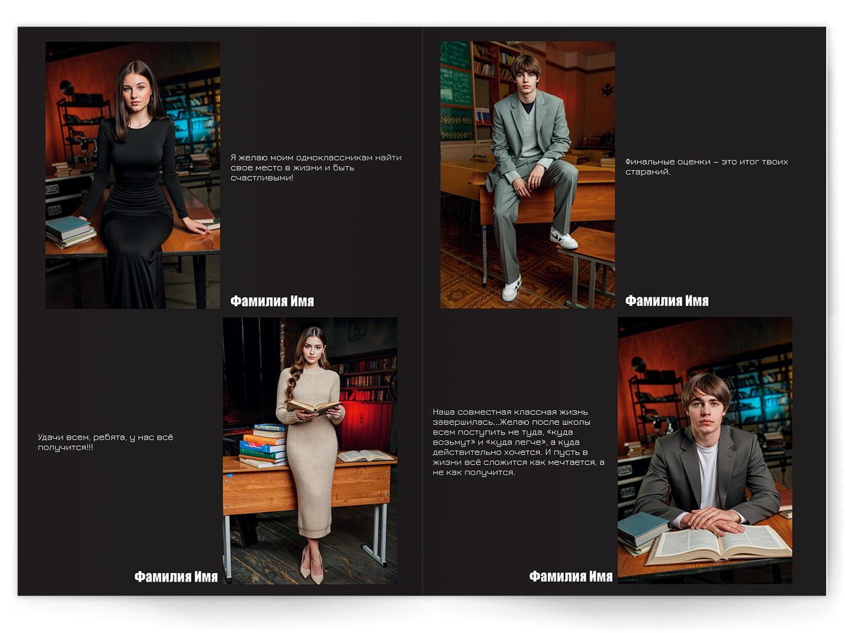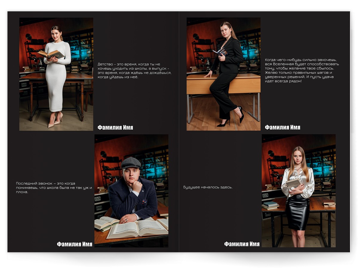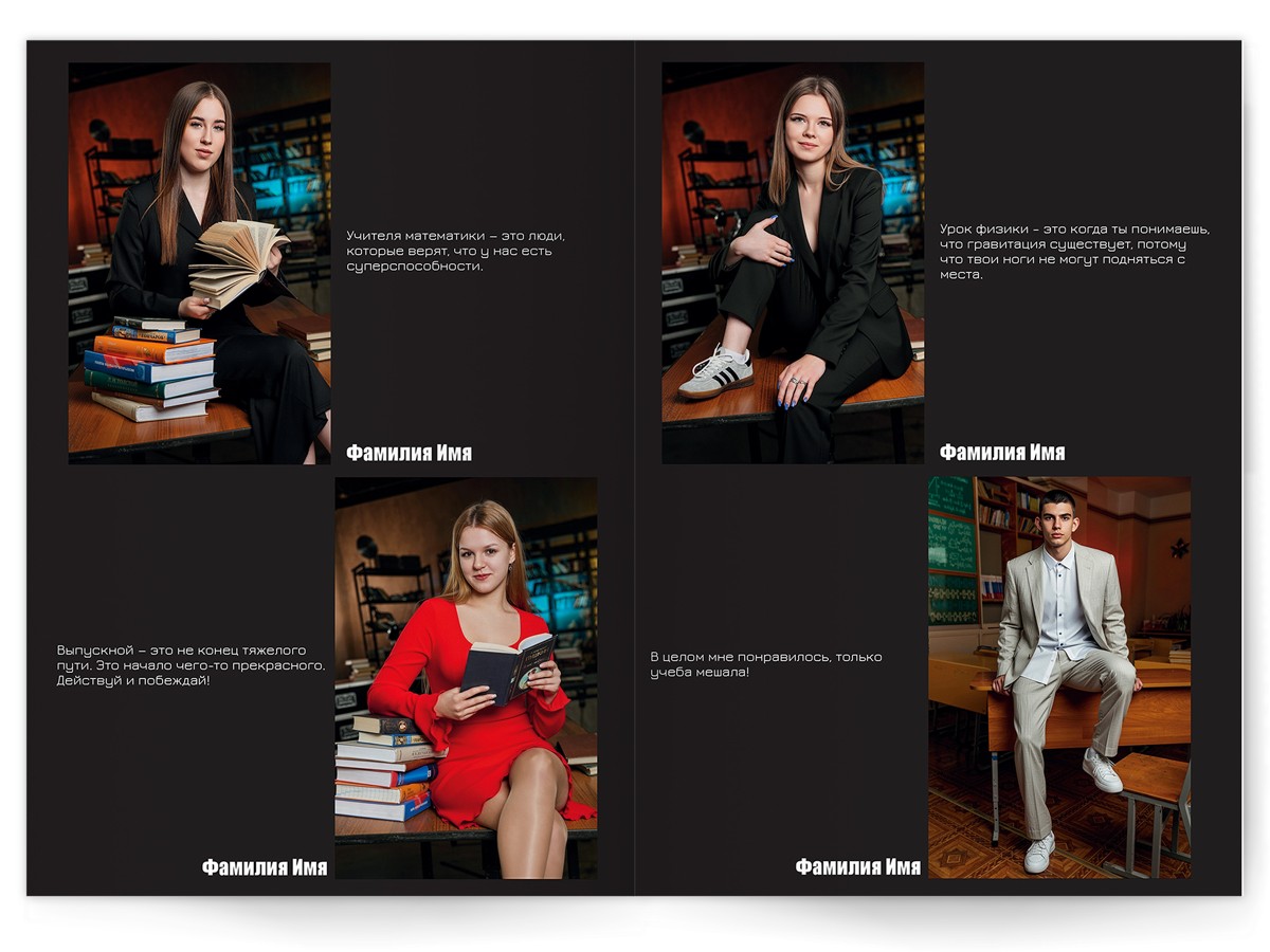 Портреты всех одноклассников и классного руководителя на развороте или второй портрет на всю страницу слева, справа портреты всех одноклассников и классного руководителя
