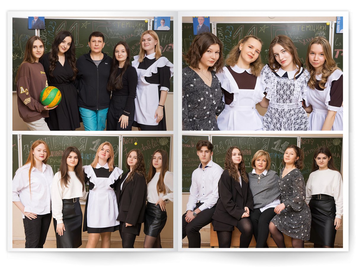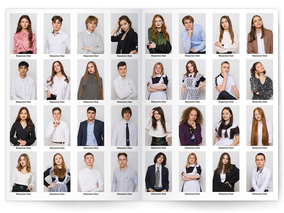 Портреты всех одноклассников и классного руководителя на развороте или второй портрет на всю страницу слева, справа портреты всех одноклассников и классного руководителя